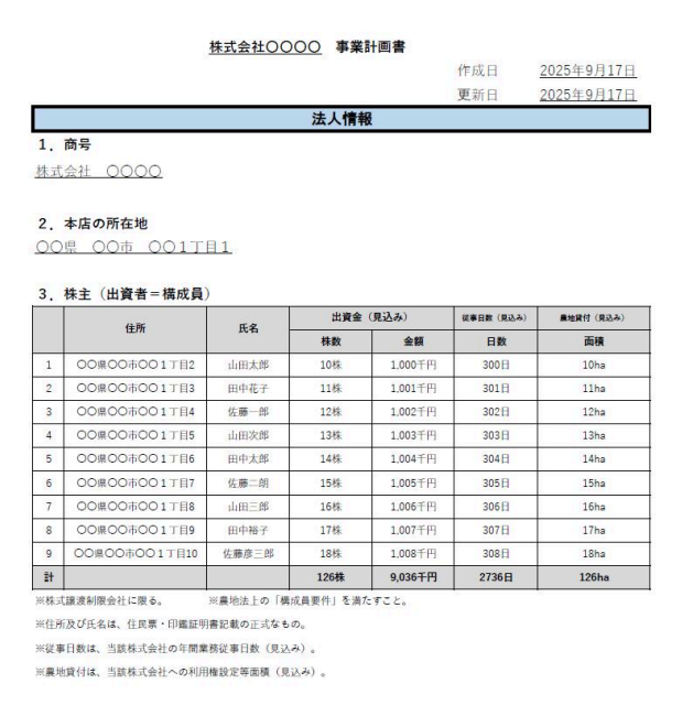 フローに従って必要な情報を入力するだけで、法人化に必要な事業計画書を簡単に作成できます。会社形態を選択(農事組合法人、株式会社)することで、それぞれのひな型に沿って事業計画書を作成することが可能です。作付計画、損益計画、資金計画など、法人化の検討に必要な情報を整理し、事業の円滑な推進を支援します。