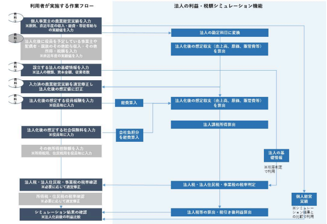 個人事業主の農業における直近の経営実績の数値をもとに、法人化後の想定する収支や役員報酬、法人が負担する社会保険料を入力することで法人の利益や税額の概算値をシミュレーションできます。また役員個々のその他収入や想定される各種控除額も入力することで個人の税額の概算値もシミュレーションできます。